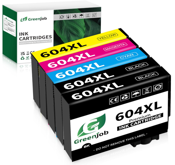 El Greenjob 604XL es un pack de cartuchos de tinta compatibles con impresoras Epson (Expression Home XP-2200/XP-3200/XP-4200 y Workforce WF-2910/2930/2935/2950). Viene en packs de 4 o 5 unidades (negro, cian, magenta, amarillo) y ofrece un rendimiento aproximado de 550 páginas en negro y 350 páginas por color (a 5 % de cobertura). Los cartuchos pasan un control de calidad y se presentan en embalaje reciclable.