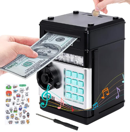 Ideal como regalo interactivo para niños de 4–10 años: combina juguete y educación financiera, tiene buena capacidad y un nivel de seguridad básico que les divierte. No es una caja fuerte “real” (plástico, motor sencillo), pero cumple su función de fomentar el hábito del ahorro y cuidar su dinero. Si buscas un acabado más robusto o completamente silencioso, habría que mirar modelos metálicos o sin motor.
